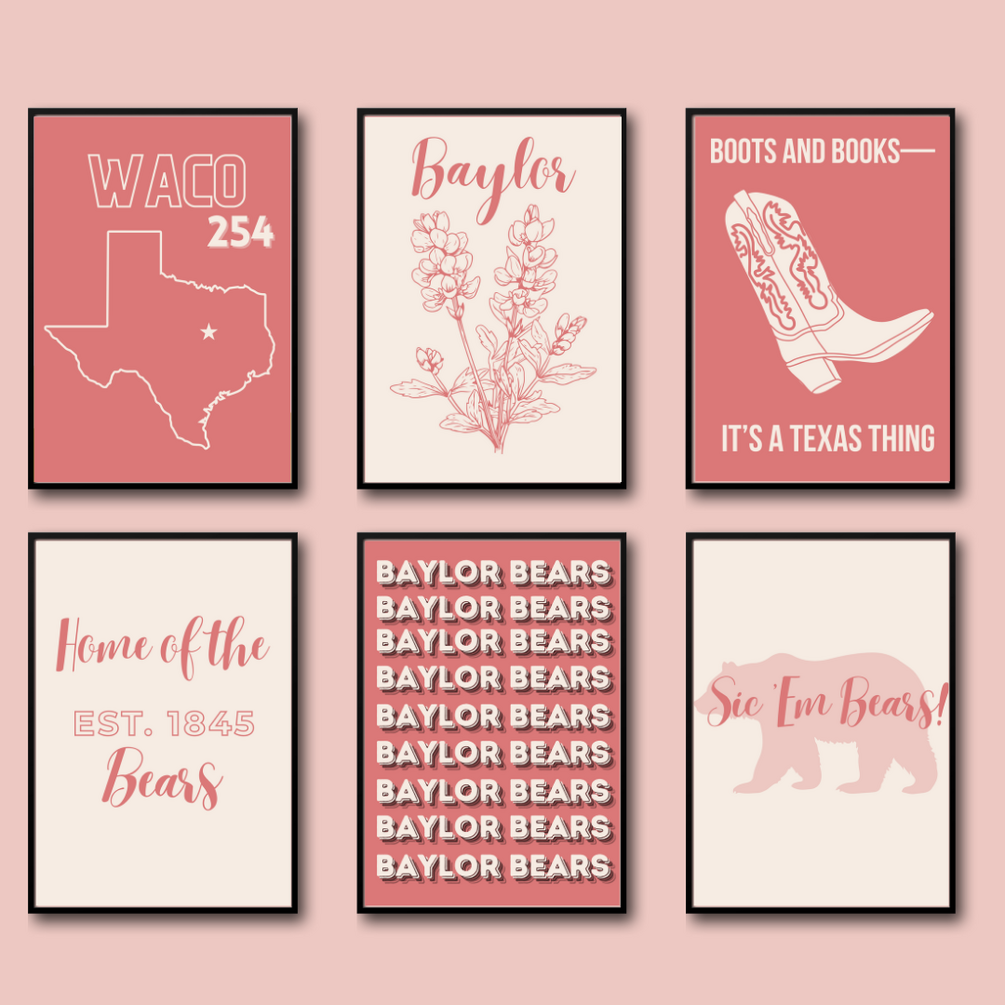 Celebrate your Baylor pride in style with this charming set of pink-toned wall art prints! Perfect for dorm rooms, apartments, or home offices, this 6-piece digital set showcases Texas roots and Baylor spirit through a soft, trendy design. Each print highlights iconic Texas and Baylor themes—like boots and books, bluebonnets, and “Sic 'Em Bears!”—making it the perfect gift for students, alumni, or fans of the Baylor Bears.