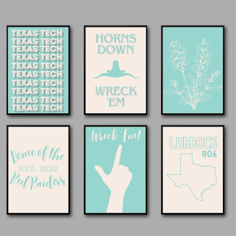 6 fun teal Texas Tech Poster Downloadables! Perfect for printing in any size. This set includes an 11x17 and 8.5x11 sets of these fun posters! Perfect for printing and placing in any space! Having these digitally means you have unlimited ways to use them!